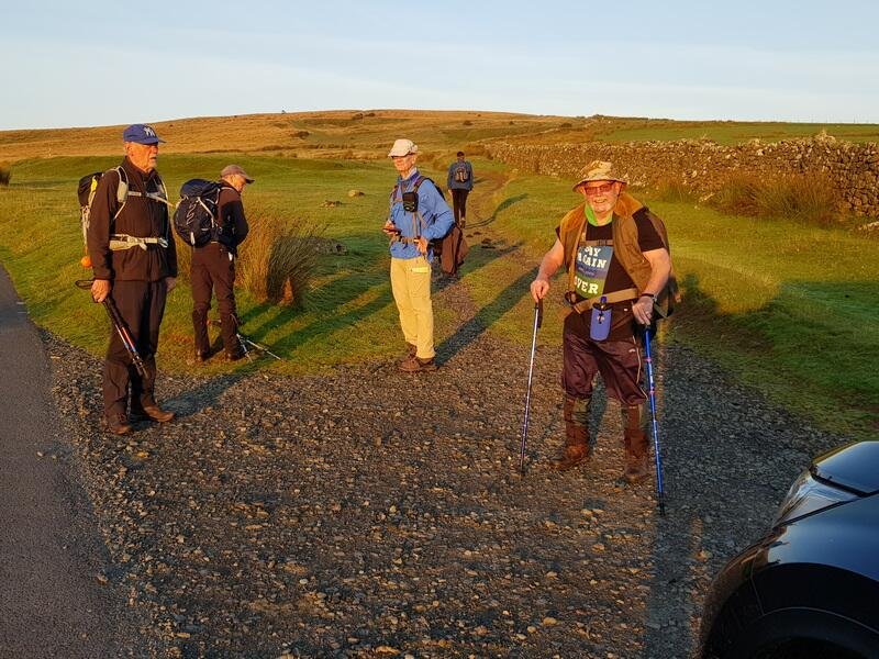 Ten Tors 2021 - First signs of a warm day ahead. L to R John Birkinshaw, Chris Endean, Andrew Locke, Bob Clarke & Bernie walking up to Anthony Stile. Okehampton Camp is a short walk across the field behind the wall on R/H/S.