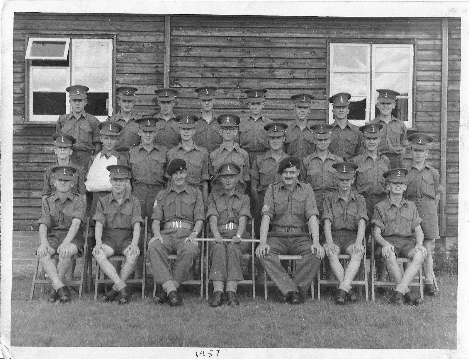Bernard Derrick - July 1957 M Troop - Rear Row: Sgt Johnny Sells, Cpl Whit Whittingham, Cpl Bry Day, Granny Groves, Lcpl Max Muxworthy, Jock Kuston, Lcpl Mick Hebdon, Lcpl Didge Derrick - Centre Row: SSM Harry Harrison, Terry Day, Doug Hartland, Paddy Cox, Lcpl Doc Lemons, Sparky Miles, Cpl Chris Puffett, SSM Olly Oliver, Smudge Smith - Front Row: Lcpl Howe, Scouse Rostron, Sgt Pape, Lt Hunt, Sgt Crabbe, Bry Eastoe, Lcpl Bugs Bougourd.