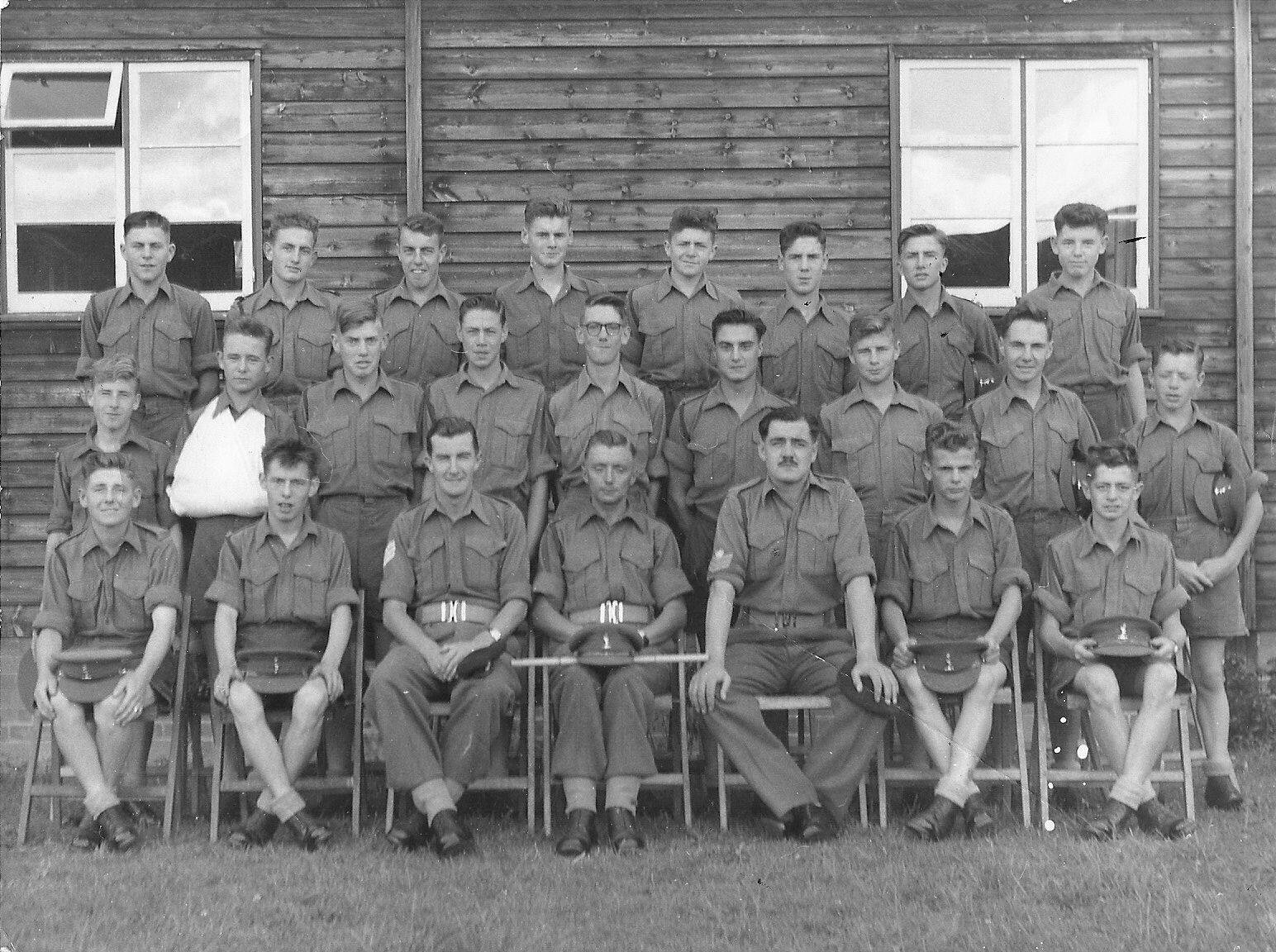 Bernard Derrick - July 1957 M Troop - Rear Row: Sgt Johnny Sells, Cpl Whit Whittingham, Cpl Bry Day, Granny Groves, Lcpl Max Muxworthy, Jock Kuston, Lcpl Mick Hebdon, Lcpl Didge Derrick - Centre Row: SSM Harry Harrison, Terry Day, Doug Hartland, Paddy Cox, Lcpl Doc Lemons, Sparky Miles, Cpl Chris Puffett, SSM Olly Oliver, Smudge Smith - Front Row: Lcpl Howe, Scouse Rostron, Sgt Pape, Lt Hunt, Sgt Crabbe, Bry Eastoe, Lcpl Bugs Bougourd.