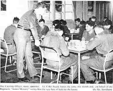 Inside the cookhouse showing catering office Lt Stacey to Frank Cunningham - behind Lt Stacy showing back of the head of Dave Silburn - Tony Gask looking at the camera - Roy Foy in the background also looking at the camera - on the right showing the back of Fred Knox.