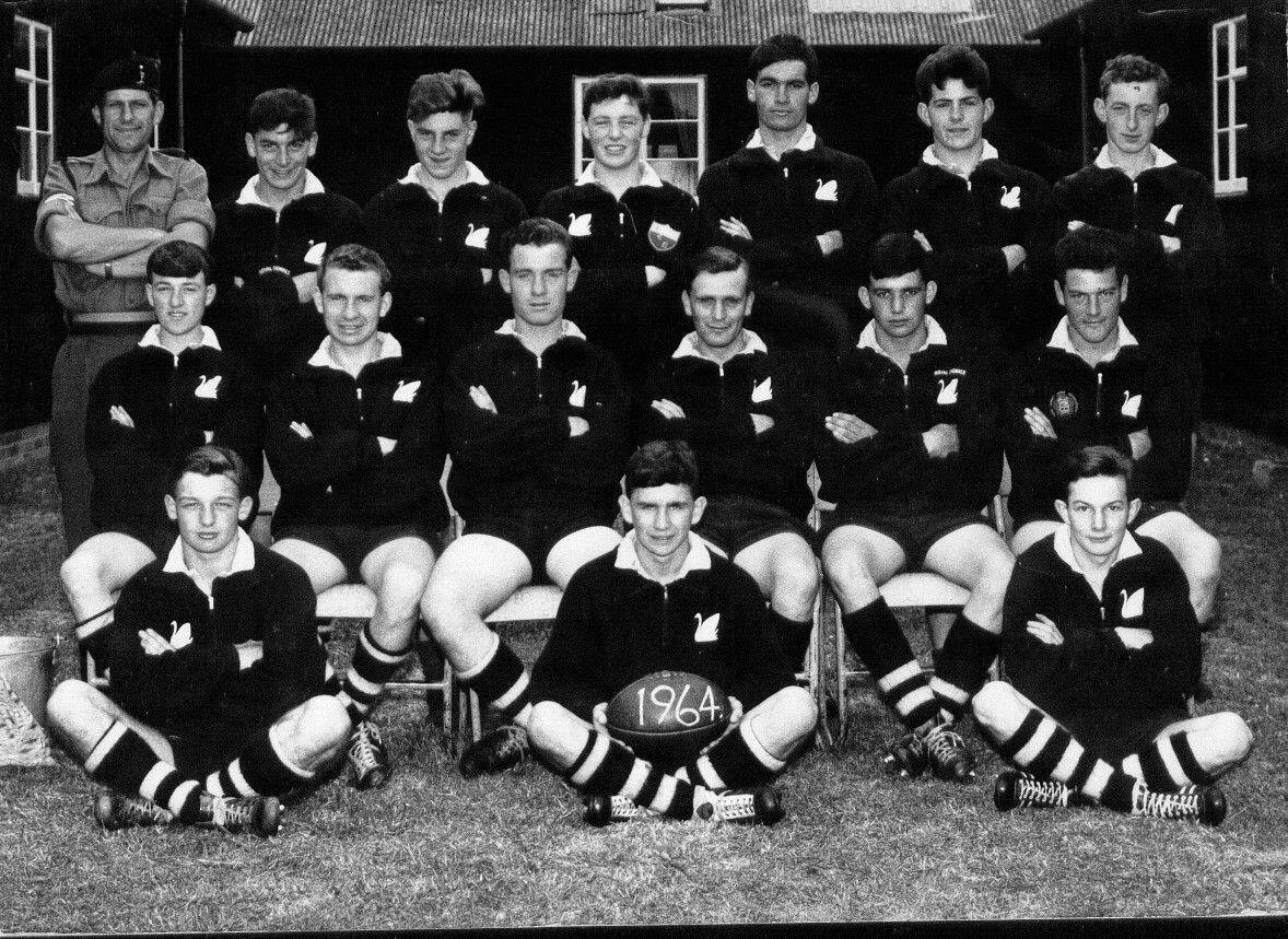 Rugby Team K Tp 1964 - (L to R) Rear row: Sgt Whitehead?, ?, ?,Jock Robertson, ?, ?, Jock?, Centre Row: Chris Blackman, Dave Hartrey, Tony Feegan, Capt Mike Adams, Bruno ?, Pete Mallinder - Front Row: Bob Orton, Freddie Carr, Geoff Jackman.