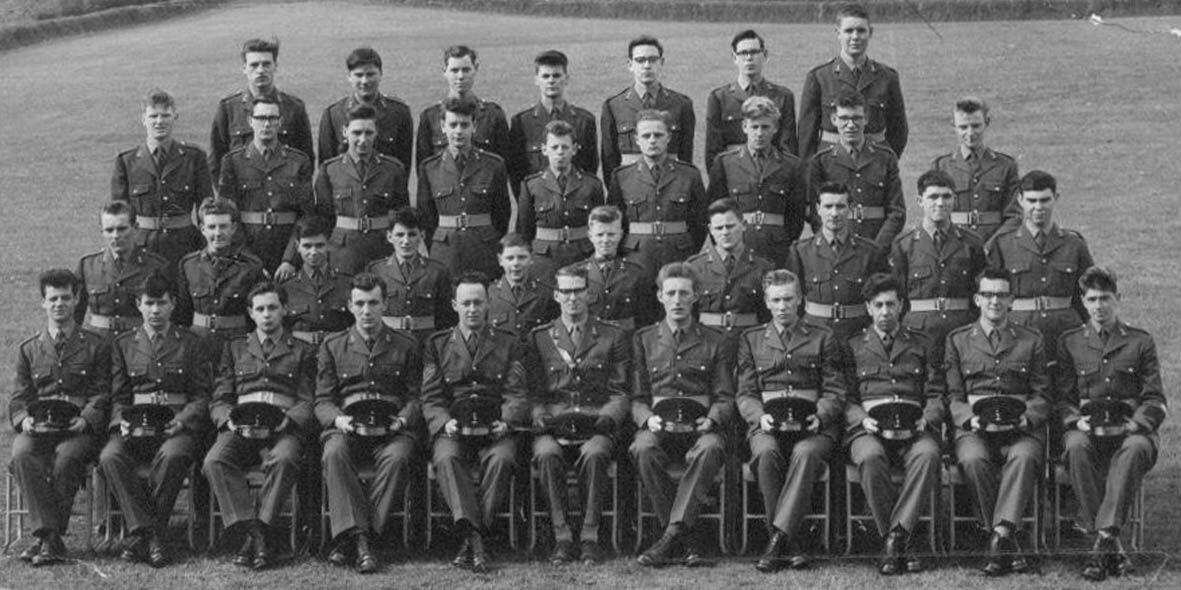 Iron Troop Summer Term 1962 - L to R Back row: 'Tiny' Berrington, Johnny LePage, Charlie Burchill, Eddie Forester, ? Forster, Bob Wright, John Long, Jim 'Chalky' White, Mick Horrell, 'Tanky' Orrell, 'Dutch' Holland, 'Wacky' Walker, 'Titch' Hargreaves - 3rd row: Arthur Langsford, Bert Walker,'Nosher' Nash, Sid Vivien, Ted Lyth, Jock Dewar, Paul Newlands, Eddie Craig, Johnny Barkworth, Paddy Hodgen, Geoff Young, 'Vamp' Mellor - 2nd row: Dick Richardson, Bill Lockhead, Viv Crudge, Dave Shaw, Florrie Lawrence, 'Shiny' Harmston, Mick Kennedy, 'Dully' Dulston, Jock Salvona, 'Annie' Oakley, 'Tat' Simpson, 'Titch' Hadrick, 'Nobby' Noble - Front row: Jim 'General' Reid, Peter Goode, 'Ginge' Lister, 'Curly' Curliss, Ricky Cousins, Lt 'Fruity' Rowntree, Sgt burnham, 'Titch' Cunningham, Jock Goodwin, 'Mac' McGookin.